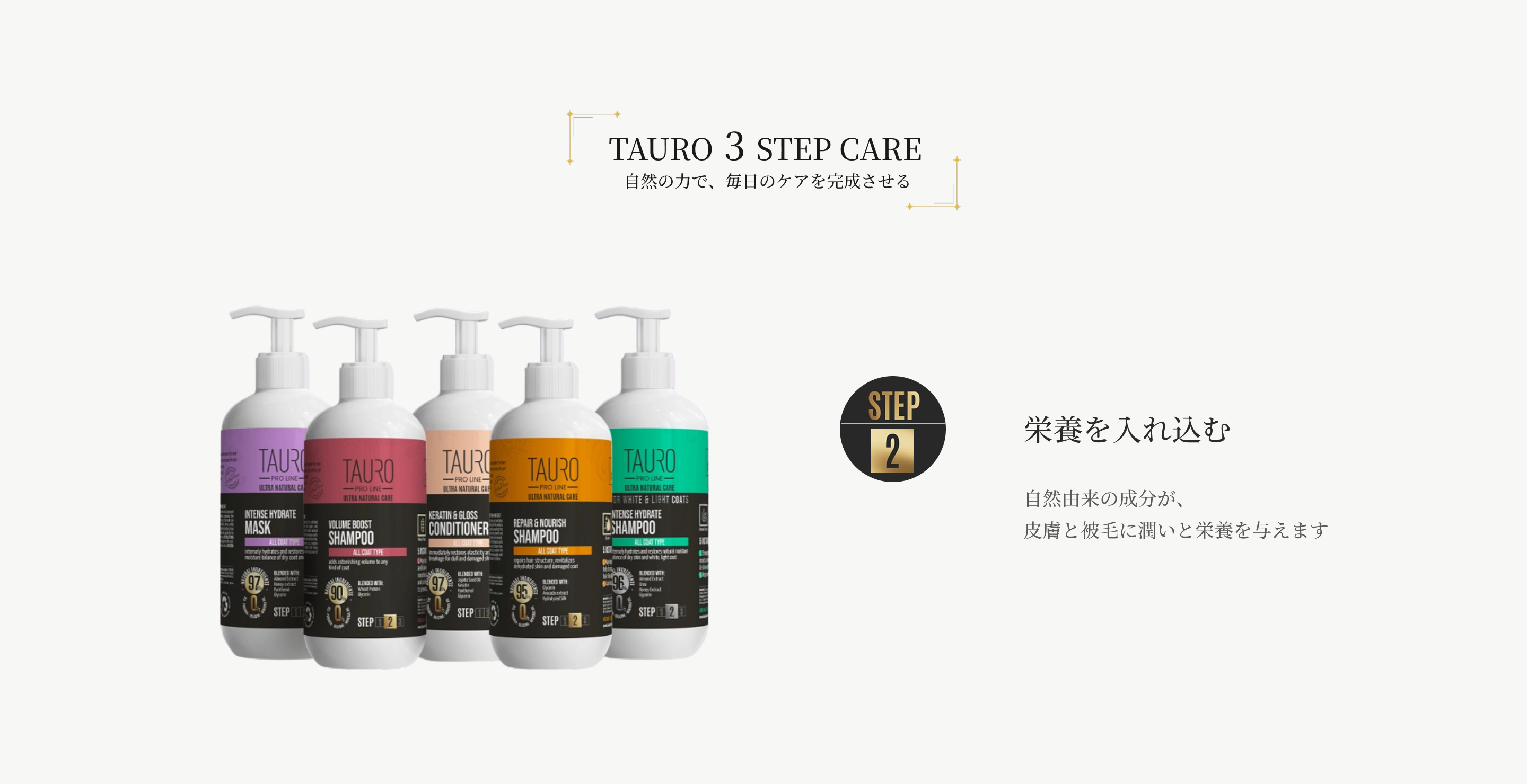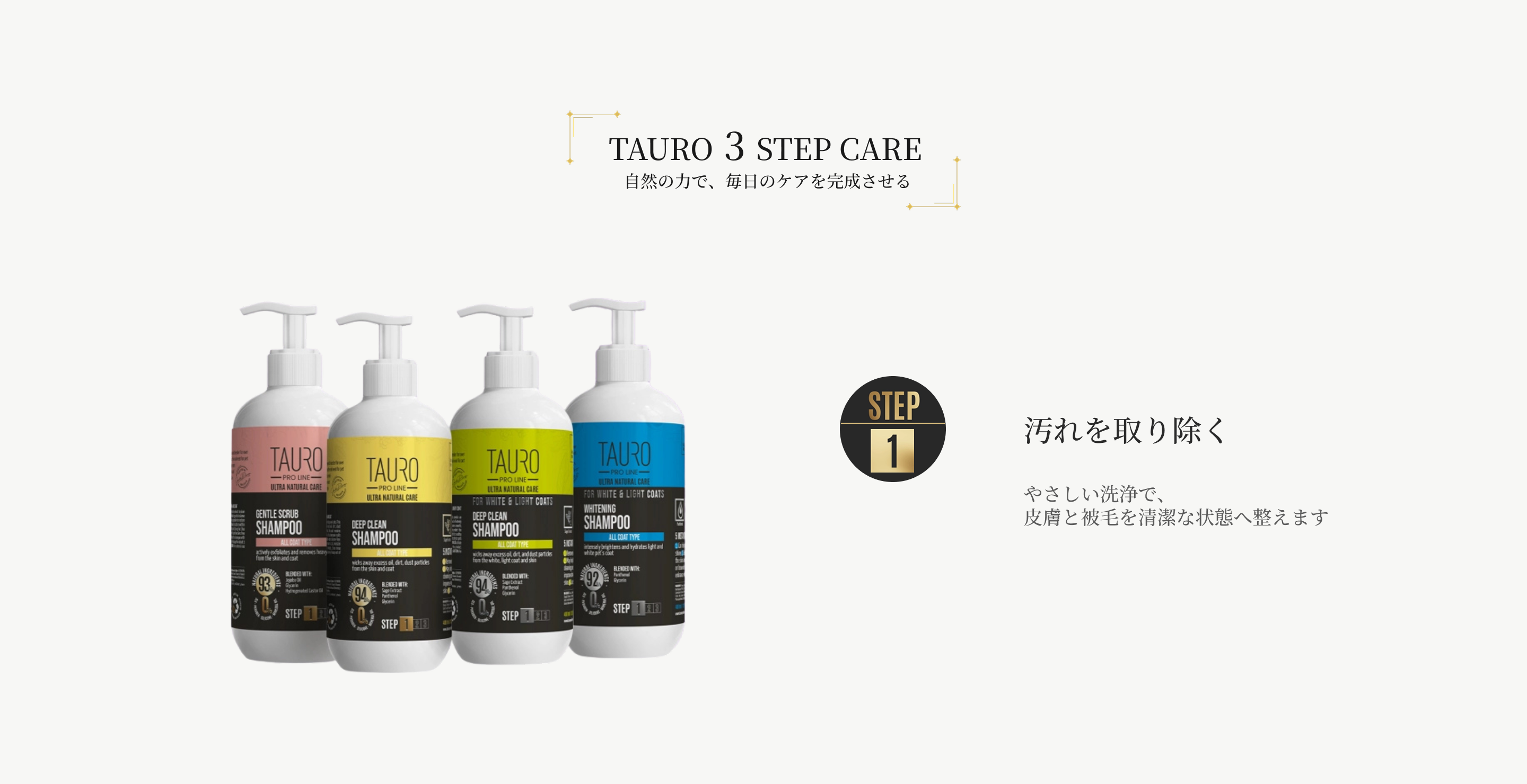 TAURO PRO LINE(タウロ プロ ライン)は、ペットの皮膚と被毛の健康を最優先に考えた、プロフェッショナル仕様のグルーミング・ケアブランドです。